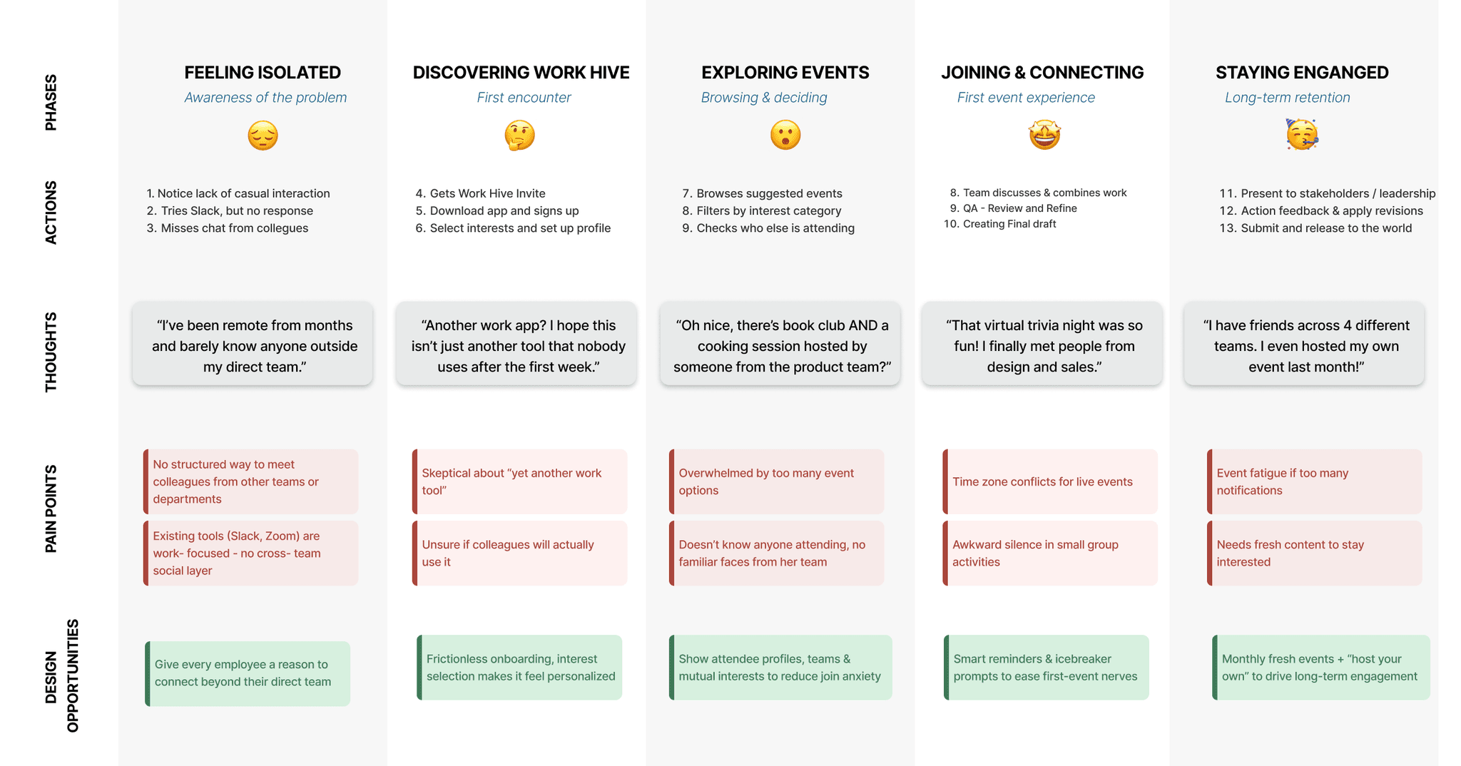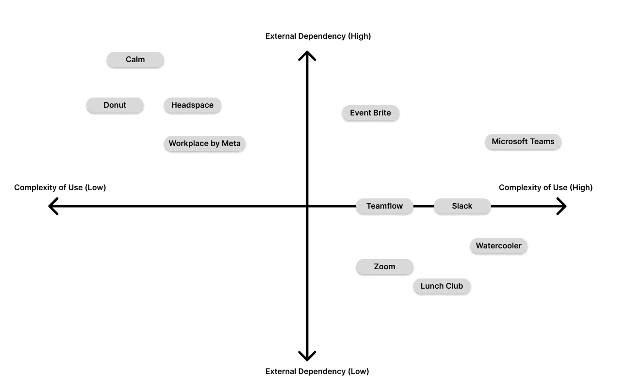 Existing remote work tools focus on productivity and communication but often lack features for meaningful social engagement. Many require facilitation by managers or HR to encourage interaction. I mapped these solutions on a graph of “Ease of Use” versus “Dependency on External Support,” highlighting opportunities for Work Hive to enable effortless, independent social connection for remote teams.